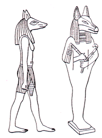 | Anubis (forme grecque de l'égyptien Inpu ou Anepu; Anpou...), dieu égyptien de Cynopolis , était représenté avec le corps d'un homme et la tête d'un chien ou de chacal. Ménès, le premier roi en date de l'ancienne Égypte ( Ancien Empire ), le fondateur de Memphis, était originaire du nome Thinite ( Abydos ), berceau de la légende osirienne qui raconte qu'Isis et Nephtys recueillirent le cadavre d'Osiris assassiné par Typhon et qu'Anubis en fut l'ensevelisseur; aussi voyons-nous ce dernier, dès les premières dynasties, adoré comme le dieu présidant à la sépulture et à l'embaumement, et son culte devint, comme celui d'Osiris, général dans la vallée du Nil. Les uns le font frère, les autres fils d'Osiris, et lui donnent Nephtys pour mère. En tant que dieu des Enfers, Anubis présidait au crépuscule, au passage du jour à la nuit ( Les jours et les nuits ), ainsi qu'au moment qui sépare la vie de la mort et à l'embaumement. Comme l'Hermès des Grecs, il conduisait les âmes jusqu'à la porte des Enfers (en l'occurrence dans la salle du jugement ( Psychostasie)). On le représente entourant de ses bras la momie couchée sur le lit funèbre ou accroupi sous la forme d'un chien, (ou d'un chacal) sur le coffret contenant le mobilier funéraire. Ses statuettes le représentent en homme à tête de chien. Représentations d'Anubis. | |