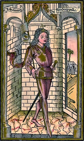 | Jehan de Mandeville, en latin Magno-Villanus, en anglais Sir John Mandeville (Jean de Bourgogne de son vrai nom) est un voyageur belge, né à Liège au commencement du XIVe siècle, mort à Liège en 1372, où il fut enterré dans l'église des Guillelmite, où l'on voit son épitaphe, à la suite de laquelle on lit ces mots en français du temps : Vos qui pascis sor mi, Par l'amor Deix proiés por mi. Il étudia la médecine dans plusieurs universités du midi de l'Europe et séjourna ensuite pendant quelque temps en Egypte pour voir de près les procédés des médecins arabes. - John Mandeville. (Miniature d'un manuscrit de 1485, Lyon). De retour à Liège, il écrivit, sous le pseudonyme de Jehan de Mandeville, la relation non seulement des voyages qu'il avait réellement faits, mais de quantité d'expéditions extraordinaires qu'il aurait entreprises dans toutes les parties du monde. Il raconte, à qui veut le croire, qu'il quitta son pays à 27 ans, traversa la France, et se rendit à la Terre-Sainte. Loin d'y guerroyer en bon chevalier contre les infidèles, il combattit sous leurs drapeaux; il servit le soudan d'Egypte, et suivit le grand khan du Cathai, dans ses guerres contre le roi de Manci (Chine méridionale). Mandeville voyagea , dans presque toute, l'Asie, et séjourna pendant trois années dans la ville de Cambalu (Pékin), résidence du grand khan. Enfin, après les aventures les plus incroyables, et une absence de trente-trois ans, il revint dans sa patrie. Pour charmer les ennuis de la solitude, comme il le dit lui-même, il écrivit la relation de ses voyages. Son ouvrage, où abondent les aventures merveilleuses, obtint une grande popularité. Tandis qu'on ne connaît qu'environ quatre-vingts manuscrits des célèbres voyages de Marco Polo et d'Odoric de Pordenone, les copies de Mandeville, traduites dans la plupart des langues d'Europe, se comptent par centaines. On vit en lui, pendant des siècles, le plus grand voyageur du Moyen âge; la critique moderne a fait justice de cette légende, publiée pour la première fois en français : à Lyon en 1480 et plusieurs fois réimprimée, notamment en 1839, à Londres, par J. O. Halliwell, en anglais, etc. L'itinéraire du voyage de Mandeville est le même que celui d'Odoric de Pordenone. Il copie des pages entières de la relation du moine italien; et quand il ne la copie pas, ses observations ont presque toujours pour objet les mêmes particularités. Il met également à contribution la géographie d'Haïton, et transcrit des morceaux entiers des romans de chevalerie , et des, vieilles chroniques du temps. On y distingue facilement des fragments d'Ogier le danois et de la belle Mélusine, que le rédacteur insère, dit-il, pour donner plus de perfection à son ouvrage. Il est possible que les moines contemporains sont les auteurs de quelques-unes des additions dont nous venons de parler, et qu'ils avaient pour but d'exciter puissamment le désir de visiter la Terre-Sainte. Il est également possible que Mandeville voulut lui-même renchérir sur ses prédeceseurs, et qu'il eut l'ambition de réunir tout ce qui avait été dit avant lui sur les pays qu'il prétend avoir connus. Il prit ses monstres dans Pline, ses miracles dans les légendes, et ses merveilleuses histoires dans les romans. Ses récits offrent des îles habitées par des géants qui ont 50 pieds de haut, des diables qui du sommet des montagnes vomissent des flammes sur les pauvres voyageurs, et un certain agneau de Tartarie engendré par un melon. Il place son prêtre Jean dans la ville de Suse; et l'histoire qu'il en rapporte semble être mêlée de quelques traditions indiennes.Toutefois on trouve dans Mandeville quelques détails plus amples sur l'Égypte, la Palestine, et quelques îles de l'Inde, que dans ses prédécesseurs. (E. H. / L. R-E). | |