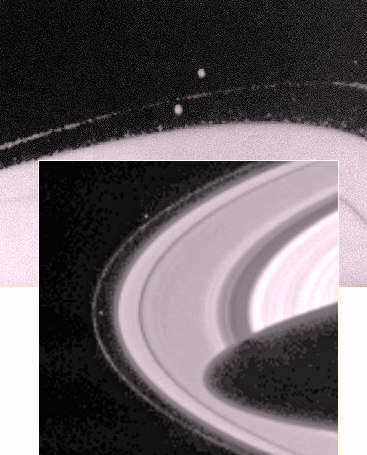 | Les satellites Prométhée et Pandora, en orbite de part et d'autre de l'anneau F de Saturne. En haut, un cliché pris par Voyager; en bas, par Cassini-Huygens, en avril 2004. Crédit : JPL, NASA. | |