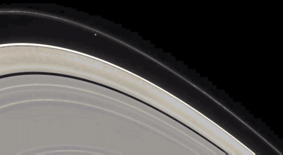 | Pandora | Prométhée | | Pandora a une longueur d'environ 84 km et une largeur de 14 kilomètres. Sa surface est apparemment très riche en cratères. Le plus grand, que l'on devine à gauche de l'image a un diamètre de trente kilomètres. | Prométhée est plus allongé encore que Pandora. Il est long d'environ 145 kilomètres et large d'une soixantaine. On y a décelé quelques sillons et vallées. Plusieurs de ses cratères dépassent les 20 kilomètres. | Sur l'image ci-dessous, obtenue par la sonde Cassini-Huygens en août 2004, Prométhée apparaît dans son rôle de berger. Il rassemble par l'effet de son attraction gravitationnelle la matière dispersée dans la région de l'anneau F et la concentre sous forme de "grumeaux" (surbrillances dispersés le long de l'anneau). - Prométhée et les anneaux de Saturne. Source : NASA; traitement : Imago Mundi. |