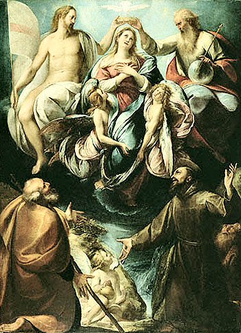| Procaccini (Camillo), peintre né à Bologne en 1545, mort à Milan en 1627, fils du précédent. Son père fut son premier maître, puis il parcourut les principales villes de l'Italie et il ne tarda pas à se former une manière plus souple et plus libre que celle d'Hercule « l'Ancien ». Camille sut éviter les minuties d'une imitation servile. L'artiste dont il s'inspira le plus souvent fut le Parmesan, dont l'élégance aimable lui servit de modèle; mais son écueil fut l'incorrection : ses figures ont fréquemment les bras et les jambes trop longs; les extrémités de ses personnages sont grosses et lourdes. Camille Procaccini produisit beaucoup : la Lombardie est pleine de ses ouvrages. Parmi les quatorze tableaux qu'il fit dans les églises de Plaisance, il en est deux ou trois qui sont tout à fait remarquables par leur allure et leur caractère de grandeur. On cite la Mort de la Vierge , peinte par lui à la cathédrale ; la Peste de Milan, une belle fresque dans l'église Saint-Augustin, et le Couronnement de la Vierge, qu'il peignit aussi pour la cathédrale de Plaisance, en concurrence avec Louis Carrache. Déjà il s'était mesuré avec Annibal dans l'église San Procolo de Reggio, ou il avait exécuté une des plus belles fresques de la Lombardie, Saint Roch secourant les pestiférés. Le Jugement dernier , dans la même église, passe pour son, chef-d'oeuvre. Etabli enfin à Milan avec ses frères, Camille Procaccini y ouvrit une école qui fut bientôt florissante. (G. Cougny). - C. Procaccini. Le Couronnement de la Vierge, ca. 1605. |