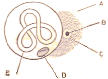 A, cytoplasme; B, centrosome; C, sphère attractive; D, nucléole; E, noyau avec son cordon pelotonné. Le centrosome est le plus souvent unique dans les cellules animales, double dans les cellules végétales. C'est un petit globule (environ 1/1000e de millimètre de diamètre) situé dans le cytoplasme, au voisinage immédiat de la paroi du noyau. Il est composé de deux centrioles, qui sont des structures cylindriques constituées de microtubules. Chaque centriole est orienté perpendiculairement l'un par rapport à l'autre. Ces microtubules sont des composants du cytosquelette cellulaire. Le centrosome est particulièrement important lors de la division cellulaire, qu'il s'agisse de la mitose (division cellulaire normale) ou de la méiose (division cellulaire réduisant le nombre de chromosomes à la moitié). Les centrioles du centrosome jouent un rôle clé dans la formation des asters, des structures en étoile constituées de microtubules qui aident à séparer les chromosomes pendant la division cellulaire. C'est le long des stries rayonnantes de l'aster que paraissent se mouvoir les chromosomes dans l'anaphase.