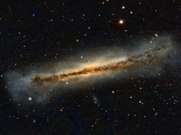 vue par la tranche et située à environ 200 millions d'années-lumière..