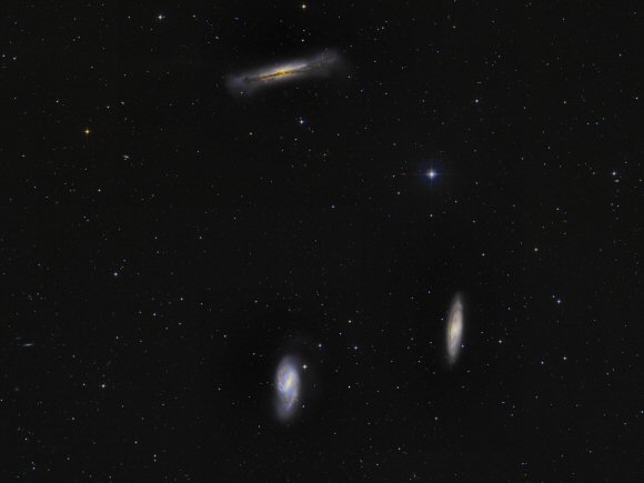 M 65 ( = NGC 3623) est une spirale de magnitude 9,60, située à 34 millions d'années-lumière. Elle appartient, comme sa voisine M 66 au triplet du Lion. Même morphologie pour M 66*** (= NGC 3627), de magnitude 8,90, et distante de 27 millions d'années-lumière. A noter sa petite barre centrale et ses bras spiraux asymétriques. Une caractéristique peut-être imputable aux effets de marée induits par sa voisine M 65. Une supernova de type Ia y a été observée en 1989. NGC 3628 (