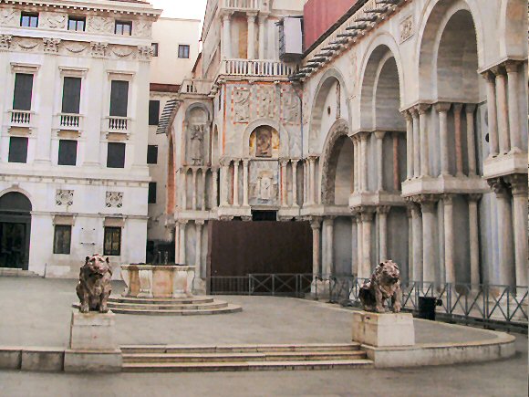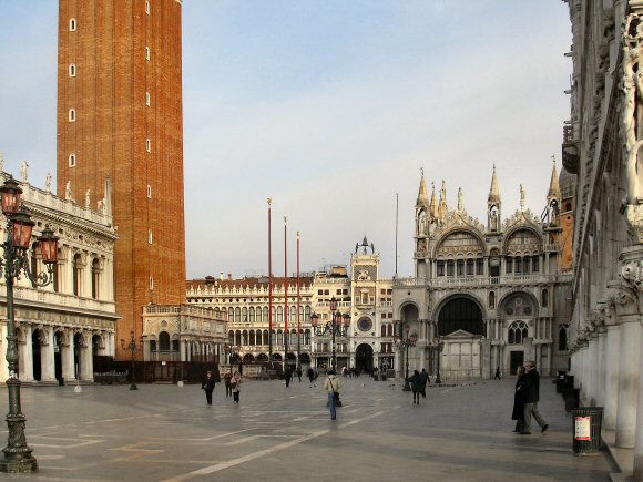 | Ainsi que par le passé, la Place Saint Marc constitue encore aujourd'hui le grand centre de la vie publique de Venise, l'endroit où les affaires atteignent leur plus grand développement, le rendez-vous et le point d'attraction général. Cette place a été nommée avec raison par Pétrarque unique au monde et jugée par Bonaparte la salle de réception la plus somptueuse. Anciennement, elle n'était qu'une prairie ou brolo, au milieu duquel coulait le fleuve Datario. En 554 Narsète y fit construire deux églises, l'une dédiée à Saint Géminien, l'autre à Saint Théodore, qui alors était le patron de la ville; et sur les ruines de cette dernière, après l'élection de Saint Marc comme patron de la ville (en 828), s'éleva la merveilleuse Basilique Saint-Marc que nous admirons aujourd'hui et qui dans ses lignes générales fut achevée dans le courant de l'année 1071. La place Saint-Marc, vue depuis le Campanile. Au fond, le musée Corre, encadré par les Procuratie Nuove (à gauche) et Vecchie.Photo : © Thierry Labat, 2010. A la suite de travaux successifs et après avoir comblé le fleuve Datario, la Place commença à prendre son aspect imposant et à se garnir avec le temps des édifices superbes et grandioses, qui gracieusement la couronnent, tels que, outre la Basilique et le Clocher (Campanile) reconstruit, le Palais des Doges. l'Ancienne Librairie (Bibliothèque Marciana), les Procuratie, la Tour de l'Horloge, etc. La Place, en forme de trapèze, mesure 175 mètres de longeur et 82 mètres de largeur du côté de la Basilique et 57 mètres du côté opposé. Dès les premiers temps de la fondation de Venise, on y donnait des spectacles, des réunions, des tournois et toute sorte d'amusements publics; on y tenait aussi la grande foire de l'Ascension, où l'on exposait les marchandises les plus variées et les plus riches provenant de l'Orient. C'est encore aujourd'hui l'endroit des principaux rendez-vous et des réunions, soit pour affaires ou pour amusement, soit pour n'importe quelle manifestation collective de la population. On y exécute périodiquement des concerts. L'histoire ou la légende des pigeons est très ancienne et se perd dans les conjectures; mais les notices les plus dignes de foi semblent être celles faisant remonter leur origine à la coutume qu'avaient les doges dans des temps très reculés de donner la clef des champs chaque année, à l'occasion du dimanche des Rameaux et du haut du portique de la Basilique, à une quantité d'oiseaux, y compris des pigeons. On prétend que ces derniers alors cherchaient un refuge parmi les interstices des colonnes de l'église, se multipliant ensuite sous la protection de Saint Marc. De temps immémoriaux le Sénat de la République pourvoyait à leur entretien avec le blé des greniers publics. La place Saint-Marc, avec la Basilique et le Campanile. Les Piliers (Mâts). Piazzetta des Lions ou Petits Lions. La Piazzetta des Lions. Au fond, le palais patriarcal, à droite la basilique Saint-Marc. Piazzetta Saint Marc. La Piazzetta vue depuis le Môle. A gauche, la Libreria Vecchia et le Campanile, au fond, les Procuratie Vecchie, la tour de l'Horloge et la basilique Saint-Marc, à droite le palais dess Doges. La Piazzetta est flanquée à gauche du Palais Ducal (Palais des Doges), à droite de l'Ancienne Librairie (Bibliothèque Marciana) et mesure 97 mètres de long et 48,70 de large. Du côté frontal donnant sur la Lagune s'élèvent deux colonnes en granit grec rougeâtre, transportées à Venise de la Syrie en 1126 par les soins du Doge Dominique Michiel après la conquête de la ville de Tyr. On dit que les colonnes effectivement transportées en ce temps-là furent trois, et que l'une d'elles étant tombée à l'eau pendant les opérations de débarquement, il ne fut plus possible de la retrouver. Les deux autres demeurèrent pendant longtemps couchées le long du quai du Môle dans l'attente d'une personne capable de les élever, lorsque (selon la tradition) en 1172 il se présenta un lombard appelé Niccolo Staratonio qui accomplit heureusement l'entreprise et qui en récompense eut le privilège de tenir un comptoir de jeux de hasard ou aux dés dans l'espace compris entre les deux colonnes. A cause de ce tripotage des jeux, on lui appliqua le sobriquet de Barattiere ou Barettieri ( = tricheur). Le doge André Gritti voulant en 1420 faire cesser l'usage des jeux de hasard aux pieds de la colonne, ordonna que dans cet espace fussent pendus les coupables de haute trahison et c'est la que trouva aussi la mort le comte de Carmagnole en 1492. La Piazzetta et ses deux colonnes. A gauche le palais des Doges, au fond, San Giorgio Maggiore. © Photos : Serge Jodra, 2012. Les chapiteaux sont en style italo-byzantin, et il existait à la base des groupes (maintenant presque entièrement rongés par l'action du temps), dont on présume qu'ils représentaient les arts et les métiers Venitiens. En 1329, dans l'une des deux colonnes et précisément dans la plus mince et plus longue, on plaça la statue de Saint Théodore, ancien protecteur de la ville, au pied duquel est un dragon au corps de crocodile; dans l'autre le Lion ailé de Saint Marc, qui en 1797 fut enlevé par Napoléon et transporté à Paris d'où il fut restitué en 1815. La conséquence en fut que le Lion dut subir beaucoup d'avaries et pour cette raison être soumis à différentes réparations. Il fut restauré pour la dernière fois en 1892 par Louis Vendrano; mais il ne reste plus de l'original que la tête et les pattes antérieures. (A. Scrocchi). |