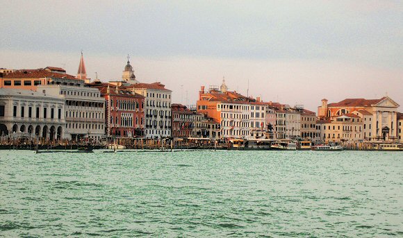 Tout près de là se trouvent aussi l'hôtel Savoia e Jolanda, à l'angle duquel un passage couvert donne accès au Campo San Zaccaria et à l'église San Zaccaria, où l'on voit murées des inscriptions lapidaires reproduisant des ordres des Illustrissimes et Excellentissimes Executeurs du Blasphème. Revenus sur la Rive des Esclavons, on trouve l'hôtel Paganelli, l'hôtel Londra et la pension Wildner, à l'angle du Rio dei Greci; puis passant le pont de la Pitié, dénommé ainsi à cause de l'invocation à la Pitié qu'y faisait chaque jour Petit Pierre d'Assises, quand il y ouvrit l'hospice pour enfants trouvés et enfants abandonnés, on trouve l'église de la Pitié ( L'église de la Piéta (Santa Maria della Visitazione), entre les ponts de la Piété et du Sépucre. Derrière, les clochers de San Giorgio dei Greci (à gauche) et de Sant Antonino. Tout au fond, les îles de San Michele (cimetière) et de Murano. En delà de l'église, passé la calle della Pietà et après avoir traversé le pont du Sépulcre, une inscription colloquée dans l'immeuble qui se trouve aux pieds du pont lui-même, rappelle que ce fut là la maison de Pétrarque; toutefois l'on croit que Pétrarque a habité plus probablement la maison qui fait l'angle de la calle del Dose, où s'élevait précisément le palais Molin dalle due Torri (Moulin aux deux tours). Nous trouvons un peu plus loin ce qui a été la caserne du Sépulcre, appelée ainsi, parce qu'il y avait là anciennement un monastère et une église avec un sépulcre identique à celui du Christ à Jérusalem. La belle porte, due à Vittoria, en fut construite aux frais du médecin et philologue Thomas Rangone, dont la statue et l'inscription afférente qui ornaient ladite porte furent transportées au Séminaire della Salute, quand en 1808 le couvent et l'église en question furent fermés. En poursuivant notre promenade par la calle del Dose, nous arrivons à l'église de San Giovani in Bragora. Sur le campo où se trouve l'église susdite s'élève le palais Gritti du XVe siècle. On découvre sur la façade le blason de l'ancienne famille en question. On y remarque les traces des fresques dont elle était ornée. Le campo Bandiera e Moro. A droite, le palais Gritti. Ce campo prend aussi le nom de Bandiera et Moro, en souvenir des deux frères Bandiera, qui y habitaient dans le Palais Soderini, et de Dominique Moro qu'avec d'autres compagnons le gouvernement Bourbon fit fusiller à Cosenza en 1844. Leurs dépouilles furent ramenées dans leur cité en 1867 et ensevelies dans l'église dei SS. Giovanni e Paolo. En poursuivant vers San Pietro, on trouve près du pont de la Cà di Dio un ancien hospice appelé Institution de la Maison de Dieu (Hôtel-Dieu) et remontant au XVIe siècle; cet hospice servit d'abord d'asile aux pèlerins revenant de Terre Sainte, puis fut transformé et employé dès 1360 pour abriter les patriciennes ou citoyennes devenues pauvres. De l'autre côté du pont, on remarque un palais gothique, l'ex-palais Gabrieli de nos jours Hôtel Sandwirth. Sur sa façade et sur sa belle margelle de puits, il porte sculpté le blason de l'ancienne famille en question. Plus loin on voit un édifice crénelé en briques, enclavé dans la muraille sur le côté le long de la Riva degli Schiavoni; il a deux portes, l'une gothique du XIVe siècle, l'autre en style baroque de 1596, qui est surmontée de blasons et d'inscriptions. Cet édifice servait anciennement comme fours; on y cuisait le pain pour les milices de la République. Passé le pont de bois et en cheminant le long des Fondamentas, on aboutit à l'entrée de l'Arsenal. (A. Scrocchi). La Riva dei Schiavoni entre le palais des Prisons et l'église de la Piété, depuis le bassin de Saint-Marc. © Photos : Serge Jodra, 2012. |
