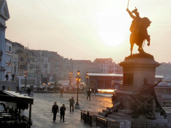 | La Riva degli Schiavoni (Rive des Esclavons) est la plus belle entre les localités riantes de Venise; c'est l'esplanade la plus réjouissante qu'on puisse imaginer, grâce à l'incomparable panorama qui se déroule devant elle, à la vaste étendue de sa Lagune sillonnée d'innombrables embarcations de tout genre, gracieusement parée de ses îles environnantes, grâce à la majesté des palais jalonnant les rives du Grand Canal et grâce enfin à la superbe perspective du Lido. Son nom est dû à l'habitude qu'avaient d'atterrir sur cette rive les navires marchands provenant de l'Esclavonie (Dalmatie Méridionale). - La Riva dei Schiavoni, à Venise. A son origine, qui remonte au IXe siècle, sa largeur ne dépassait pas celle du pont de la Paille, mais en 1780 on en entreprit l'élargissement sur délibération du Sénat. L'exécution de ce travail fut conférée à l'architecte Temanza, qui en porta la largeur à la mesure actuelle. C'est sur cette rive que fut tué en 1172, à la suite d'un soulèvement du peuple, le doge Vital Michiel II et ici que mourut, frappé d'apoplexie, l'architecte Antoine Selva le 22 janvier 1879. C'est encore sur cette Riva que se dresse, dans l'espace compris entre le pont du Vin et le pont de la Piété, le monument voté par les Vénitiens en l'honneur de "Victor Emmanuel II, père de la patrie". Cette oeuvre est due au sculpteur Ferrari qui l'exécuta en 1887. La statue équestre en représente le roi au moment de livrer bataille. Deux groupes s'appuient sur la base du monument représentant l'un Venise opprimée (1848-1849), l'autre Venise délivrée (1866). Sur le piédestal il y a deux bas-reliefs qui représentent, celui de droite, l'Entrée de Victor Emmanuel à Venise en 1866; celui de gauche, la Bataille de Palestre le 31 Mai 1859. Le statues et les bas-reliefs sont en bronze; le piédestal et la base sont en granit. Le monument de Victor Emanuel II, sur la Riva dei Schiavoni. Passé le pont de la Paille, on voit le palais des Prisons construit entre 1571 et 1597 par Antonio da Ponte en remplacement des Pozzi du Palais Ducal. La maçonnerie en est en pierre d'Istrie. L'édifice a l'air austère du côté qui donne sur le Canal, alors que la façade donnant sur la Riva degli Schiavoni paraît quelque peu élégante et a un joli portique au rez-de-chaussée. Cette partie du palais était réservée à l'habitation des six magistrats appelés : Signori di notte al Criminal.