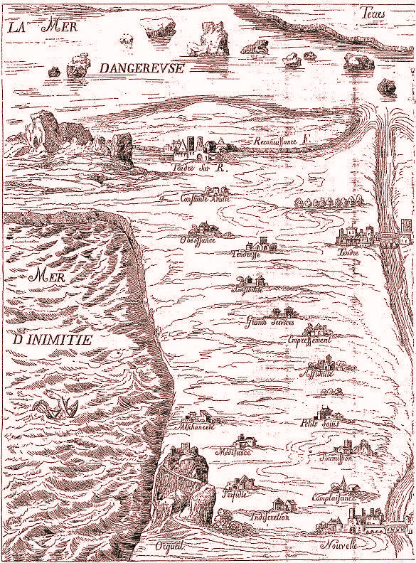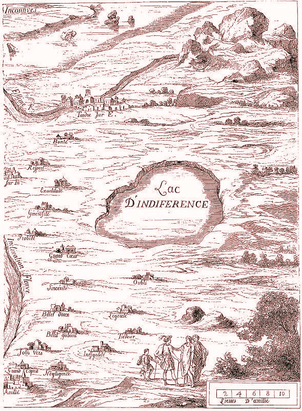 | Clélie , fameux roman de Mlle de Scudéry, publié en 1656. C'est là que se trouve une conception allégorique qui eut alors un grand succès, le Pays de Tendre, dont la carte n'est pour nous qu'un jeu puéril, mais était pour les initiés une analyse de l'amour ingénieusement figurée : La Carte du Tendre. Qui n'a entendu parler de la Carte de Tendre? Mais qui la connaît? Elle n'existe plus que dans un très petit nombre de bibliothèques et de collections d'estampes. Il est vrai qu'à ne la considérer que sous le rapport du goût, elle mérite sa mauvaise fortune : sa rareté est aujourd'hui à peu près son seul titre. Cependant il faut se souvenir qu'elle a fait époque dans notre histoire littéraire; elle caractérise une veine spirituelle. Mais égarée, du dix-septième siècle elle résume, pour ainsi dire, une école. En ce sens, elle n'est pas indigne d'un coup d'oeil. Après l'avoir un moment parcourue, on en aura du moins une idée nette toutes les fois qu'il y sera fait allusion. Peu de temps après la dispersion de la société de l'hôtel Rambouillet, il se forma autour de Madeleine de Scudéry une réunion littéraire qui ne tarda pas à acquérir une grande célébrité. C'était le samedi que se rassemblaient chez elle les beaux esprits de l'époque, au nombre desquels on comptait Sarrasin, Conrart, Pellisson, le duc de Saint-Aignan, Godeau, etc., qui tous avaient pris des surnoms tirés le plus souvent des romans alors à la mode. Rien ne peut mieux donner une idée du langage sophistiqué et contourné qui était presque de rigueur dans ces réunions que les ouvrages de mademoiselle de Scudéry. L'un de ses romans, Clélie, 10 vol. in-8, renferme entre autres une description d'un pays allégorique, le pays de Tendre, que Boileau a ridiculisé dans ses Héros de roman. C'est du premier volume de Clélie que nous avons extrait la carte de ce pays, et la description qui en est faite par le cavalier Célère à la princesse des Léontins.  "La première ville située au bas de la carte est Nouvelle-Amitié. Comme on peut avoir de la tendresse par trois causes différentes, ou par une grande estime, ou par reconnaissance, ou par inclination, on y a établi trois villes de Tendre sur trois rivières qui portent ces trois noms, et on a fait aussi trois routes différentes pour y aller. Si bien que comme on dit Cumes sur la mer d'Ionie et Cumes sur la mer Thyrrène, ont dit aussi Tendre-sur-Inclination, Tendre-sur-Estime, et Tendre-sur-Reconnaissance. Cependant, comme Clélie a présupposé que la tendresse qui naît par inclination n'a besoin de rien autre chose pour être ce qu'elle est, elle n'a mis nul village le long des bords de cette rivière, qui va si vite, qu'on n'a que faire de logement le long de ses rives pour aller de Nouvelle-Amitié à Tendre. Mais pour aller de Tendre-sur-Estime il n'en est pas de même; car Clélie a ingénieusement mis autant de villages qu'il y a de petites et de grandes choses qui peuvent contribuer à faire naître par estime cette tendresse dont elle entend parler. En effet, vous voyez que de Nouvelle-Amitié on passe à un lieu qu'on appelle Grand-Esprit, parce que c'est ce qui commence ordinairement l'estime. Ensuite vous voyez ces agréables villages de Jolis-Vers, de Billets-Galants et de Billets-Doux, qui sont les opérations les plus ordinaires du grand esprit dans les commencements d'une amitié. Ensuite, pour faire un plus grand progrès dans cette route, vous voyez. Sincérité, Grand-Coeur, Probité, Générosité, Respect, Exactitude; et Bonté, qui est tout contre Tendre. Après cela il faut retourner à Nouvelle-Amitié pour voir par quelle route, on va de là à Tendre-sur-Reconnaissance. Voyez donc, je vous prie, comment il faut aller d'abord de Nouvelle-Amitié à Complaisance, ensuite à ce petit village qui se nomma Soumission, et qui en touche un autre fort agréable qui s'appelle Petits-Soins. De là il faut passer par Assiduité, et à un autre village qui s'appelle Empressement, puis à Grands-Services; et pour marquer qu'il y a peu de gens qui en rendent de tels, ce village est plus petit que les autres. Ensuite il faut passer à Sensibilité. Après il faut, pour arriver à Tendre, passer par Tendresse. Ensuite il faut aller à Obéissance, et enfin passer à Constante-Amitié, qui est sans doute le chemin le plus sûr pour arriver à Tendre-sur-Reconnaissance. Mais comme il n'y a pas de chemin où l'on ne se puisse égarer, Clélie a fait que si ceux qui sont à Nouvelle-Amitié prenaient un peu plus à droite ou un peu plus à gauche, Ils s'égareraient aussi; car si, au partir de Grand-Esprit, on allait à Négligence, qu'ensuite, continuant cet égarement, on allât à Inégalité, de là à Tiédeur, à Légèreté et à Oubli, au lieu de se trouver à Tendre-sur-Estime, on se trouverait au lac d'Indifférence, qui par ses eaux tranquilles représente sans doute fort juste la chose dont il porte le nom en cet endroit. De l'autre côté, si au partir de Nouvelle-Amitié on prenait un peu trop à gauche, et qu'on allât à Indiscrétion, à Perfidie, à Orgueil, à Médisance ou à Méchanceté, au lieu de se trouver à Tendre-sur-Reconnaissance, on se trouverait à la mer l'Inimitié, où tous les vaisseaux font naufrage. La rivière d'Inclination se jette dans une mer qu'on appelle la mer Dangereuse; et ensuite, au-delà de cette mer, c'est ce que nous appelons Terres inconnues, parce qu'en effet nous ne savons point ce qu'il y a. "